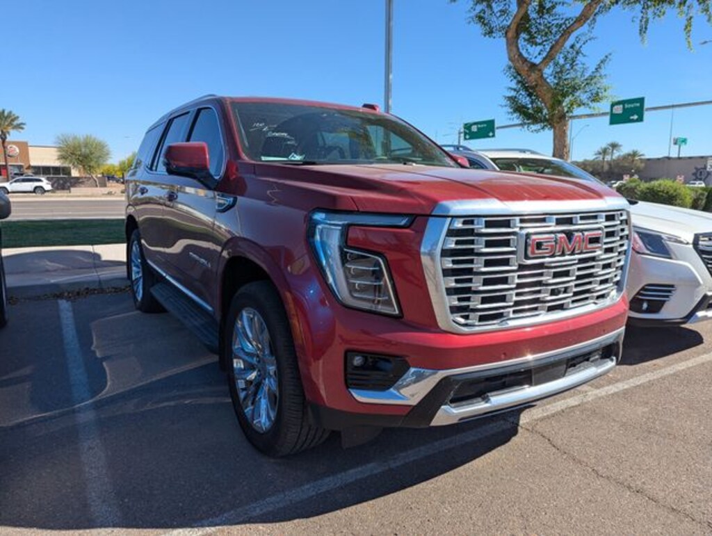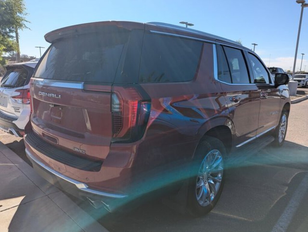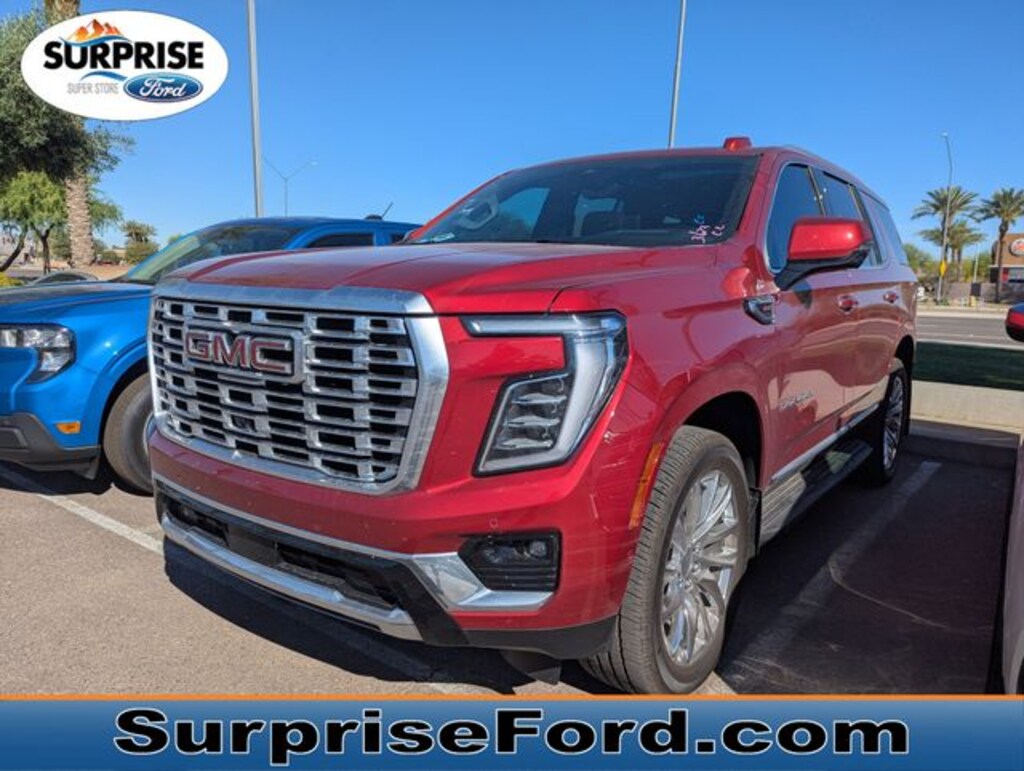 Surprise Ford is Your Pre-Owned Superstore in Arizona! Automatic Transmission, MP3, **ALLOY WHEELS**, BACK UP CAMERA, **LEATHER**, **ONE OWNER**, **LOCAL TRADE**, *LOW MILES*, *CLEAN CARFAX*, *ONE OWNER*, *LOCAL TRADE-IN*, 15" Diagonal Multi-Color Head-Up Display, 4-Way Power Driver Lumbar Seat Adjuster, 4-Way Power Front Passenger Lumbar Seat Adjuster, 4-Wheel Disc Brakes, ABS brakes, Adaptive suspension, Advanced Security Package, Advanced Technology Package, Air Conditioning, Apple CarPlay/Android Auto, Auto-leveling suspension, Automatic temperature control, AutoSense Hands-Free Power Liftgate, Bose 10-Speaker Surround with CenterPoint, Bright Front and Rear Door Sill Plates, Dual Exhaust System, Dual front impact airbags, Dual front side impact airbags, Dual-Pane Panoramic Power Sunroof, Emergency communication system: OnStar and GMC connected services capable, Exterior Parking Camera Rear, Extra Capacity Cooling System, Front dual zone A/C, Galvano Bodyside Moldings, Glass Breakage Sensor, Heads-Up Display, Heated door mirrors, Heated Driver and Front Passenger Seats, Heated front seats, Heated rear seats, Hitch View, Inside Rearview Auo-Dimming Rear Camera Mirror, Integrated Trailer Brake Controller, Magnetic Ride Control Suspension, Max Trailering Package, Memory seat, Navigation system: GMC Connected Navigation, Occupant sensing airbag, Overhead airbag, Perforated Heather and Ventilated Driver and Front Passenger Seats, Perforated Leather Seating Surfaces, Power door mirrors, Power driver seat, Power Liftgate, Power passenger seat, Power Release 2nd Row Bucket Seats, Power Tilt and Telescopic Steering Column, Preferred Equipment Group 5SA, Radio: 16.8" Diagonal Premium GMC Infotainment System, Rear air conditioning, Rear Seat Media System, SiriusXM with 360L, Smart Trailer Integration Indicator, Spoiler, Super Cruise, Theft-Deterrent Alarm System, Vehicle Inclination Sensor, Vehicle Interior Movement Sensor, Ventilated front seats, Wheels: 20" x 9" 6-Spoke Polished Aluminum. Denali 4D Sport Utility 10-Speed Automatic with Overdrive EcoTec3 6.2L V8 4WD Volcanic Red Tintcoat Clean CARFAX.