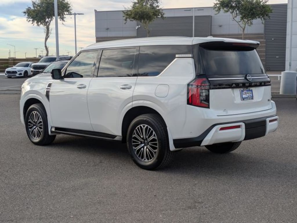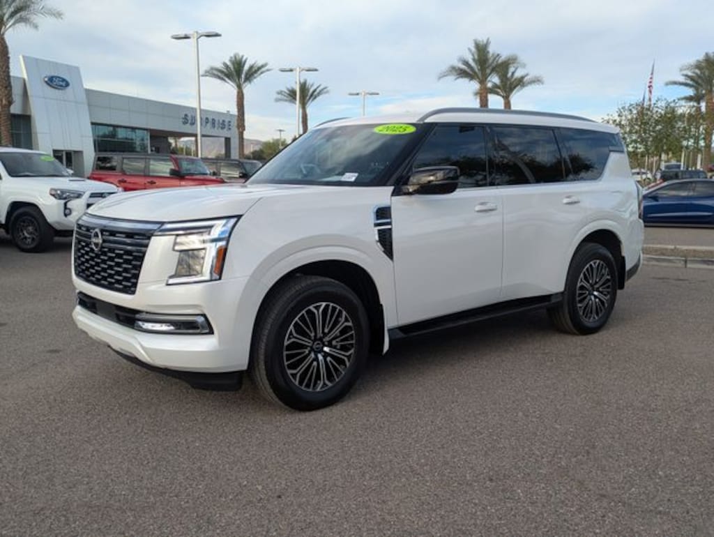 Step into the world of sophistication and power with the 2025 Nissan Armada SL, a used vehicle that promises a driving experience like no other. This Aspen White Tricoat beauty is designed for those who crave adventure without compromising on luxury. Under the hood, the 3.5L Dohc V6 engine delivers robust performance, perfectly complemented by a 9-speed automatic transmission for seamless gear shifts and superior control. Safety is paramount, with features like Blind Spot Monitor, Lane Departure Warning, and Rear Collision Mitigation ensuring peace of mind on every journey. The Armada's interior is a sanctuary of comfort and technology, boasting premium synthetic seats with heating capabilities, a state-of-the-art navigation system, and a premium sound system to make every drive a pleasure. The Aerial View Display System and Automatic Parking make urban navigation effortless, while the Adaptive Cruise Control and Lane Keeping Assist provide an extra layer of convenience on long drives. With its spacious 3rd-row seating and power liftgate, this SUV is perfect for family adventures or solo road trips. Experience the perfect blend of style, safety, and performance with the 2025 Nissan Armada SL.