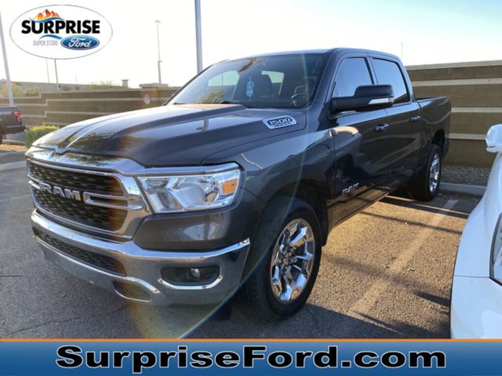Surprise Ford is Your Pre-Owned Superstore in Arizona! Automatic Transmission, MP3, **ALLOY WHEELS**, BACK UP CAMERA, **ONE OWNER**, I PHONE INTEGRATION / SYNC, *CLEAN CARFAX*, *ONE OWNER*, 2nd Row In Floor Storage Bins, 4-Wheel Disc Brakes, 4G LTE Wi-Fi Hot Spot, 8.4" Touchscreen Display, ABS brakes, Air Conditioning, Anti-Spin Differential Rear Axle, Apple CarPlay, Auto-Dimming Exterior Driver Mirror, Auto-Dimming Rear-View Mirror, Big Horn Badge, Big Horn Level 1 Equipment Group, Black Exterior Mirrors, Black Premium Power Mirrors, Bluetooth Handsfree Phone & Audio, Class IV Receiver Hitch, Cluster 3.5" TFT Color Display, Connectivity - US/Canada, Convex Wide-Angle Mirror Insert, Dual front impact airbags, Dual front side impact airbags, Emergency communication system: SiriusXM Guardian, Exterior Mirrors Courtesy Lamps, Exterior Mirrors w/Heating Element, Exterior Mirrors w/Supplemental Signals, Exterior Parking Camera Rear, For Details, Visit DriveUconnect.com, Global Telematics Box Module (TBM), Glove Box Lamp, Google Android Auto, GPS Antenna Input, Heated door mirrors, Integrated Center Stack Radio, Integrated Voice Command w/Bluetooth, Occupant sensing airbag, Overhead airbag, Power 2-Way Driver Lumbar Adjust, Power 8-Way Driver Seat, Power Adjustable Pedals, Power door mirrors, Power windows, Power-Folding Mirrors, Quick Order Package 25Z Big Horn, Radio: Uconnect 5 W w/8.4" Display, Rear Dome w/On/Off Switch Lamp, Rear Power Sliding Window, Rear Window Defroster, SiriusXM Radio Service, SiriusXM Satellite Radio, Sun Visors w/Illuminated Vanity Mirrors, Universal Garage Door Opener, USB Host Flip, Wheels: 20" x 9" Aluminum Chrome Clad (WRK). Big Horn/Lone Star 4D Crew Cab 8-Speed Automatic HEMI 5.7L V8 Multi Displacement VVT RWD Granite Crystal Metallic Clearcoat